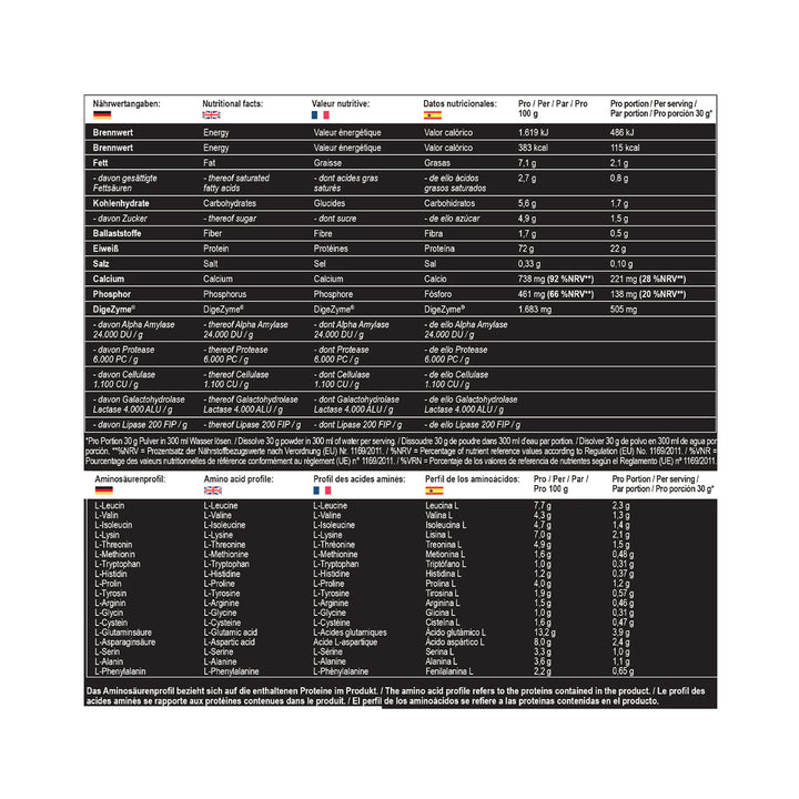 Milk protein (whey protein concentrate, emulsifier (lecithin)) 92.3%, low-fat cocoa powder, flavoring, DigeZyme® multi-enzyme complex (alpha amylase, protease, cellulase, galactohydrolase lactase, lipase), sweetener (sucralose).