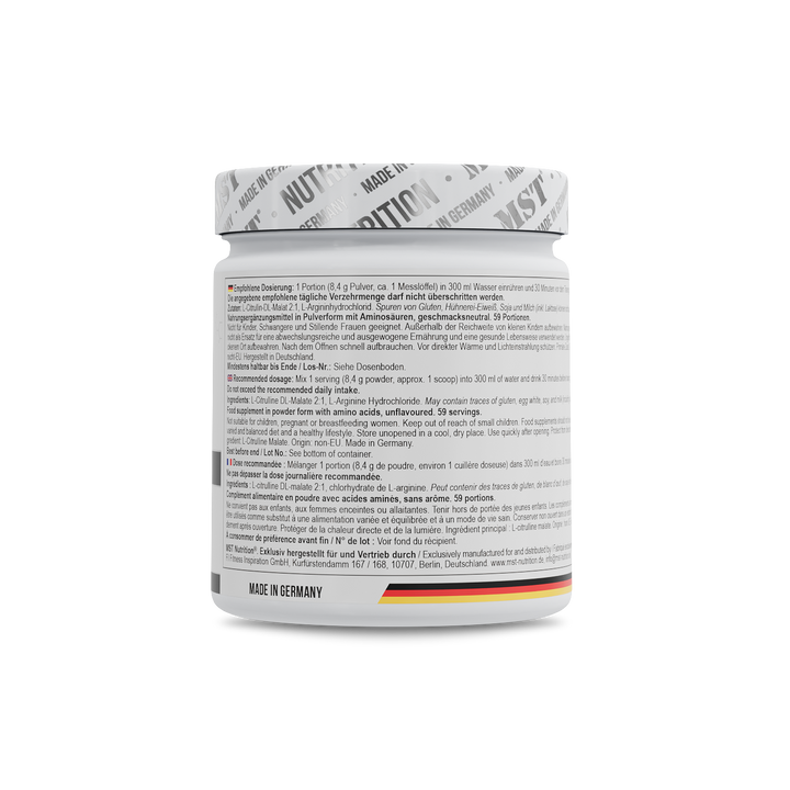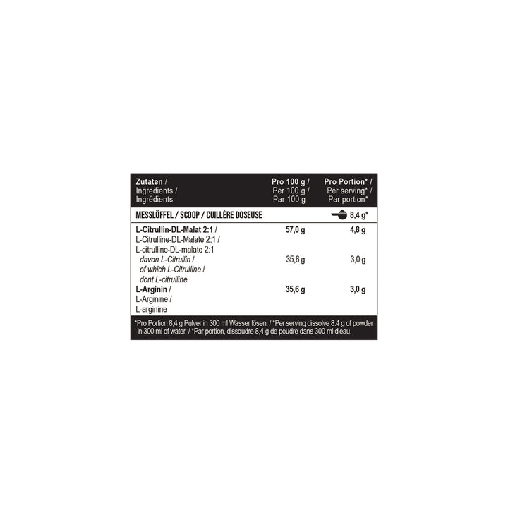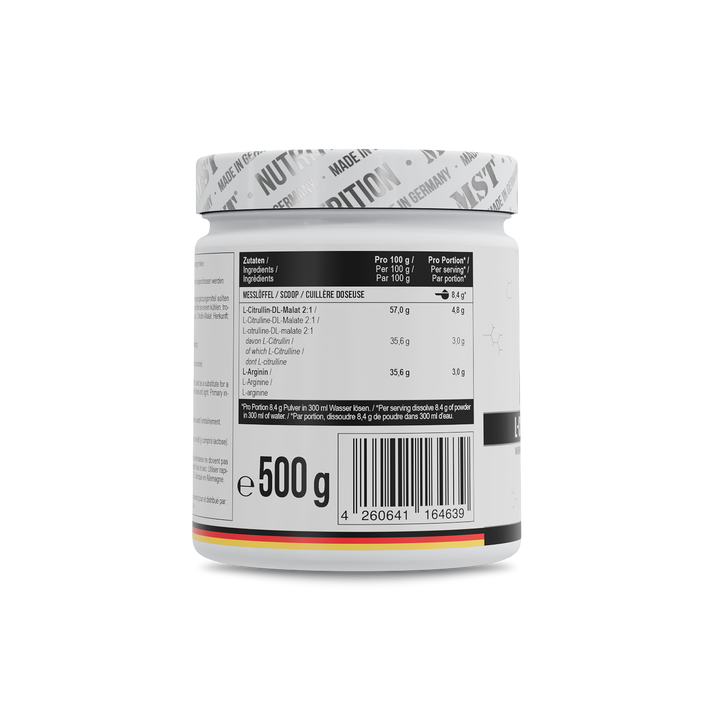- Alta dose di L-Arginina (3000 mg) e L-Citrullina (3000 mg)