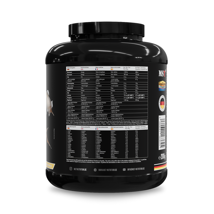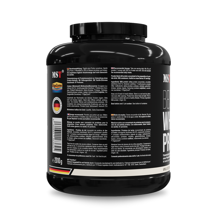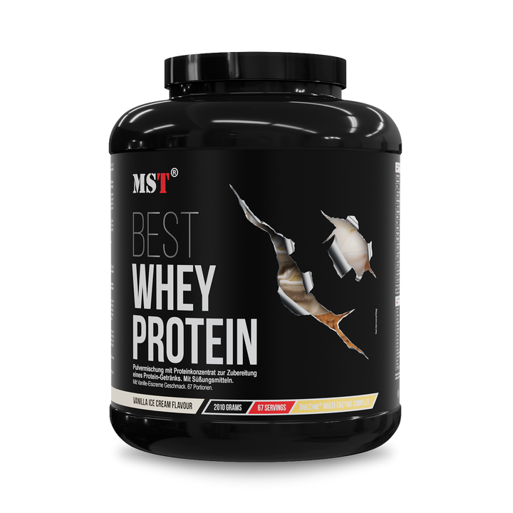 Opdag den ultimative proteinoplevelse med MST® BEST Whey Protein Vanilla Ice Cream 2010 g, suppleret med DigeZyme® – en forfriskende kombination, der forsyner din krop med protein af høj kvalitet og fordøjelsesenzymer.